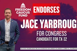 The Freedom Caucus Fund is proud to endorse Jace Yarbrough for the newly drawn Texas 32nd Congressional District open seat.
